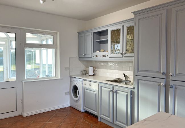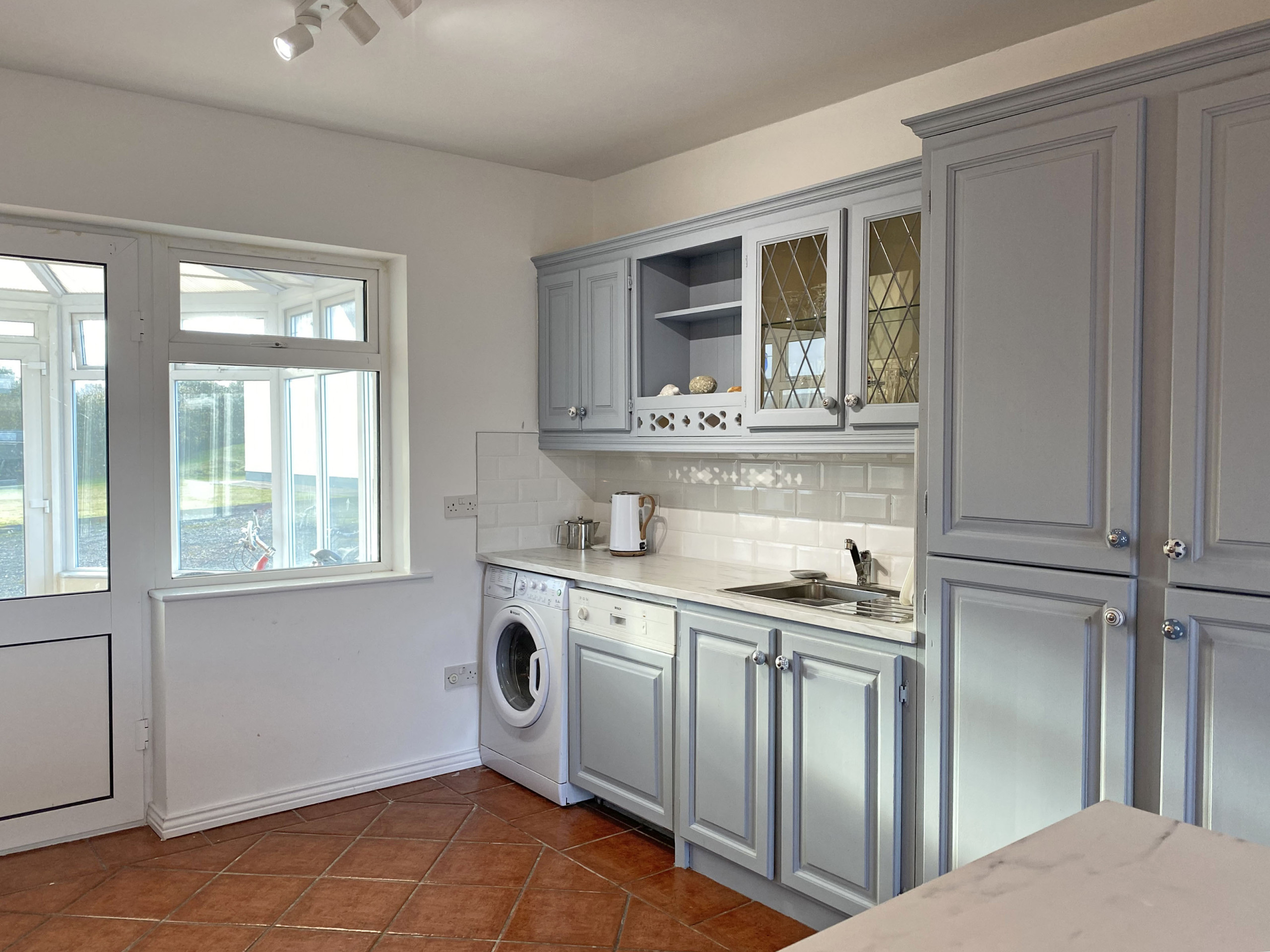 - Kitchen/dining area with electric oven & hob, microwave, kettle, toaster, dishwasher, washing machine, and tumble dryer. Dining table seats 4, with a breakfast bar for 2