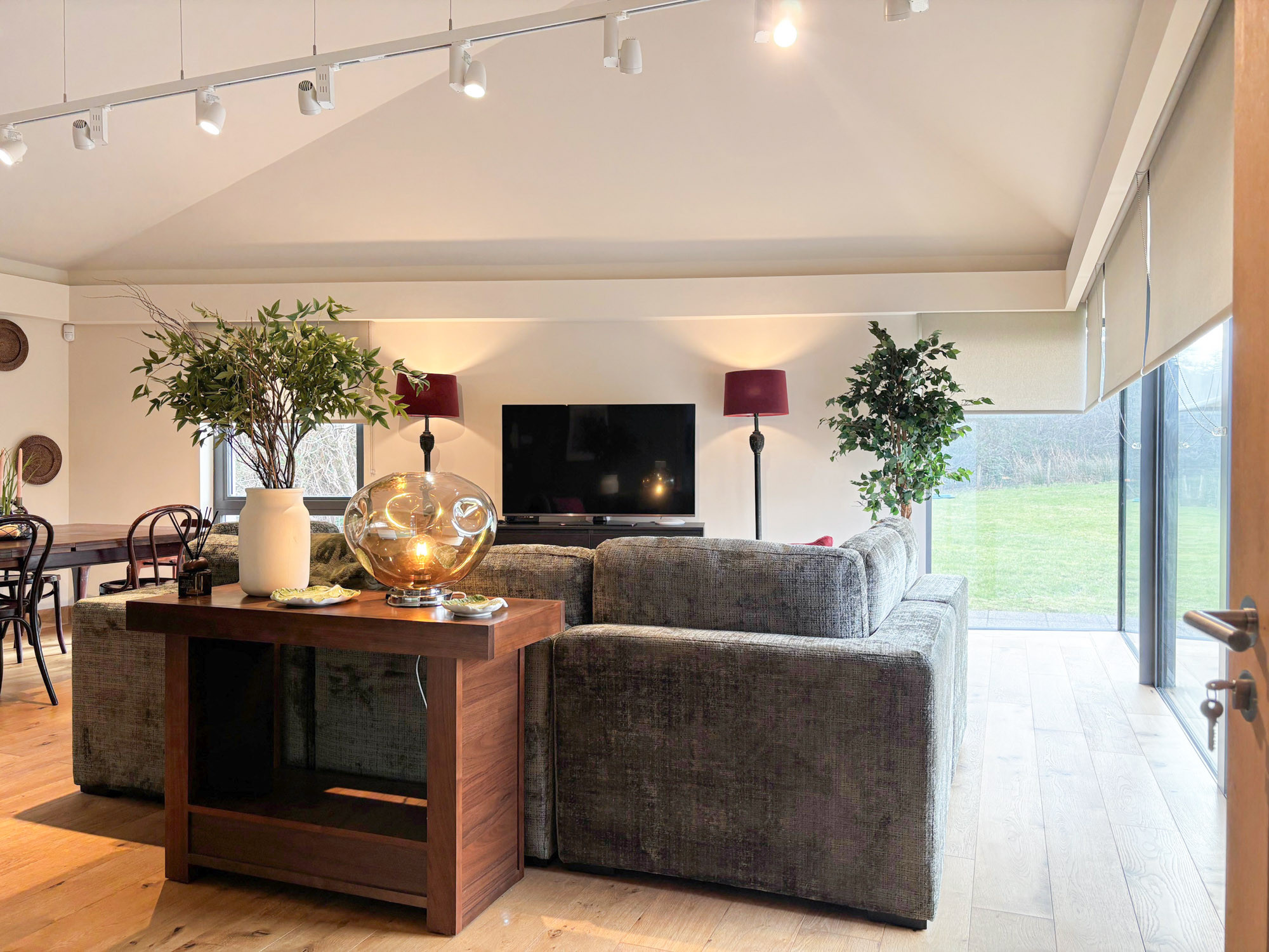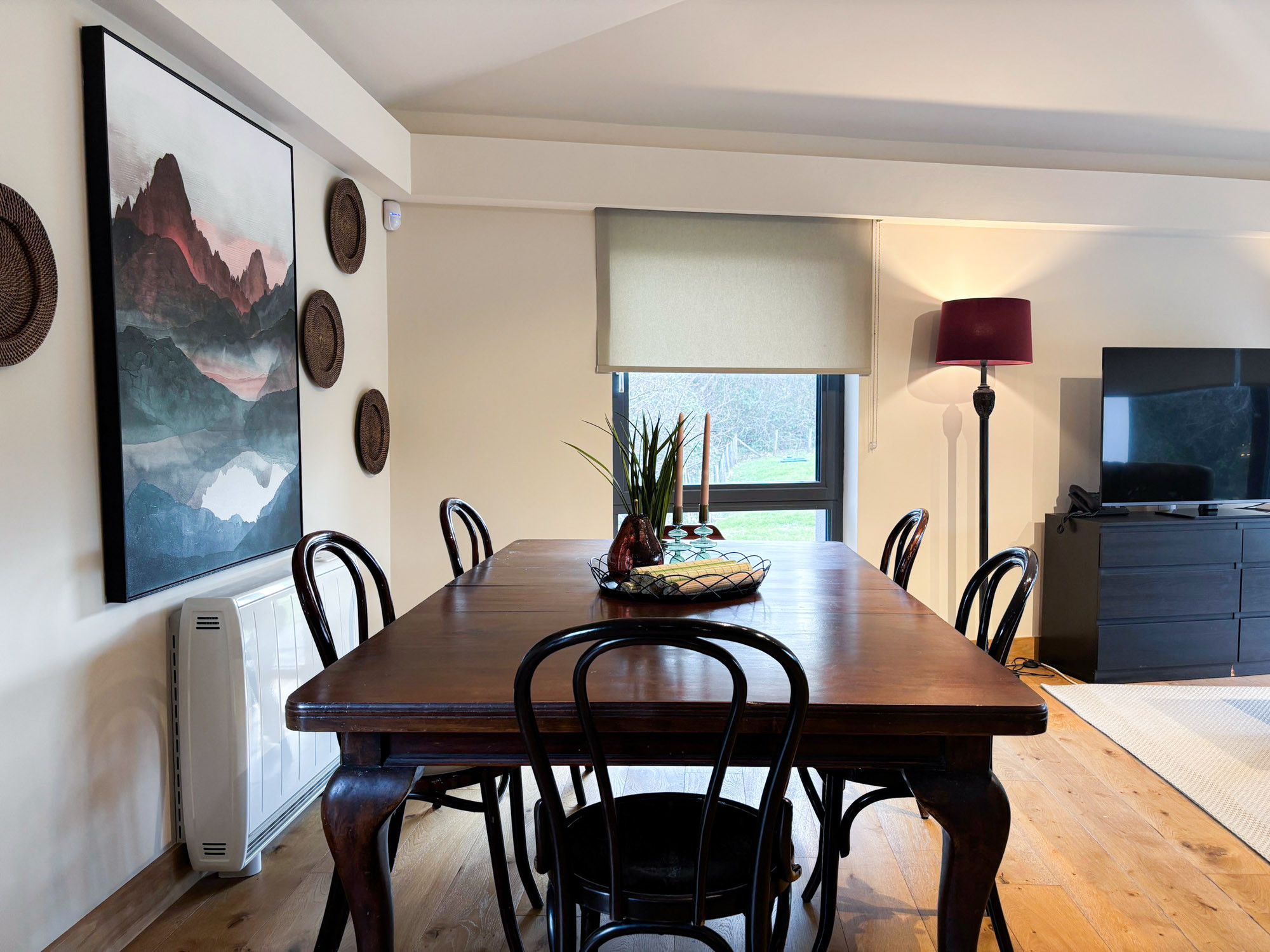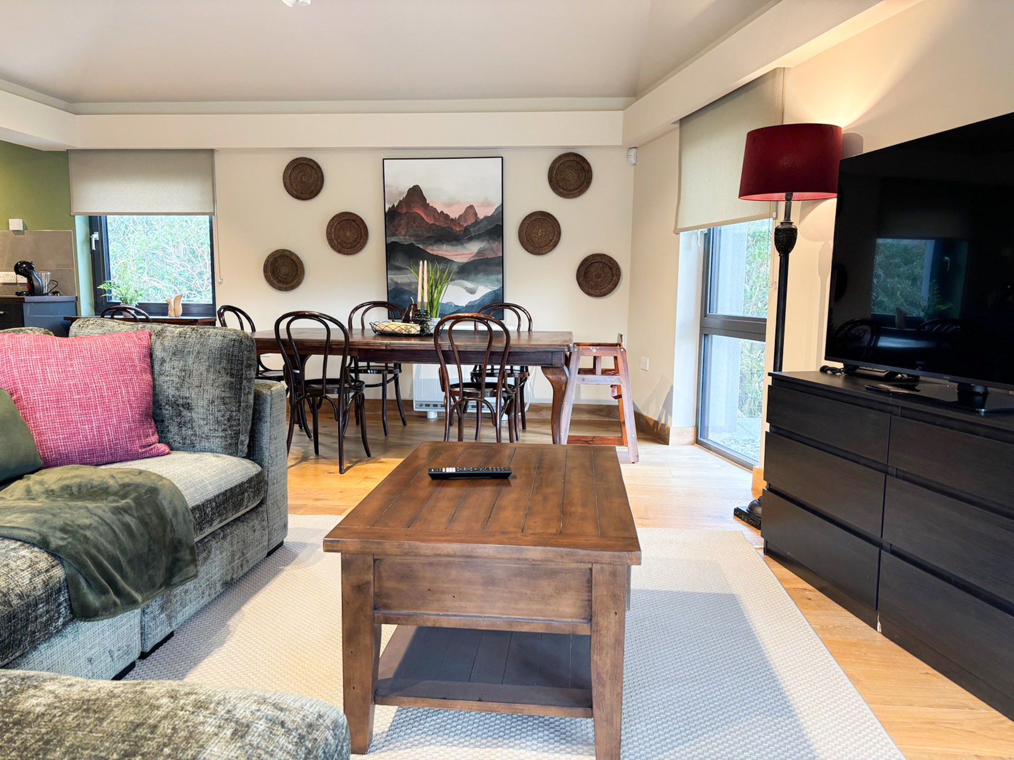 - Spacious living and dining area with comfortable seating and Smart TV
