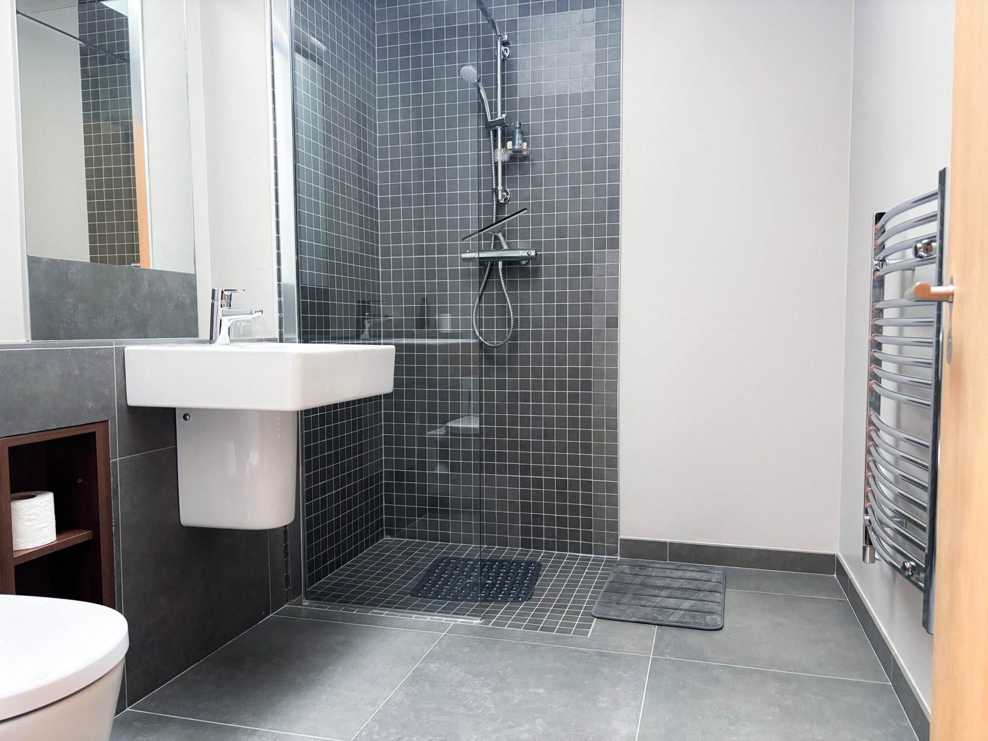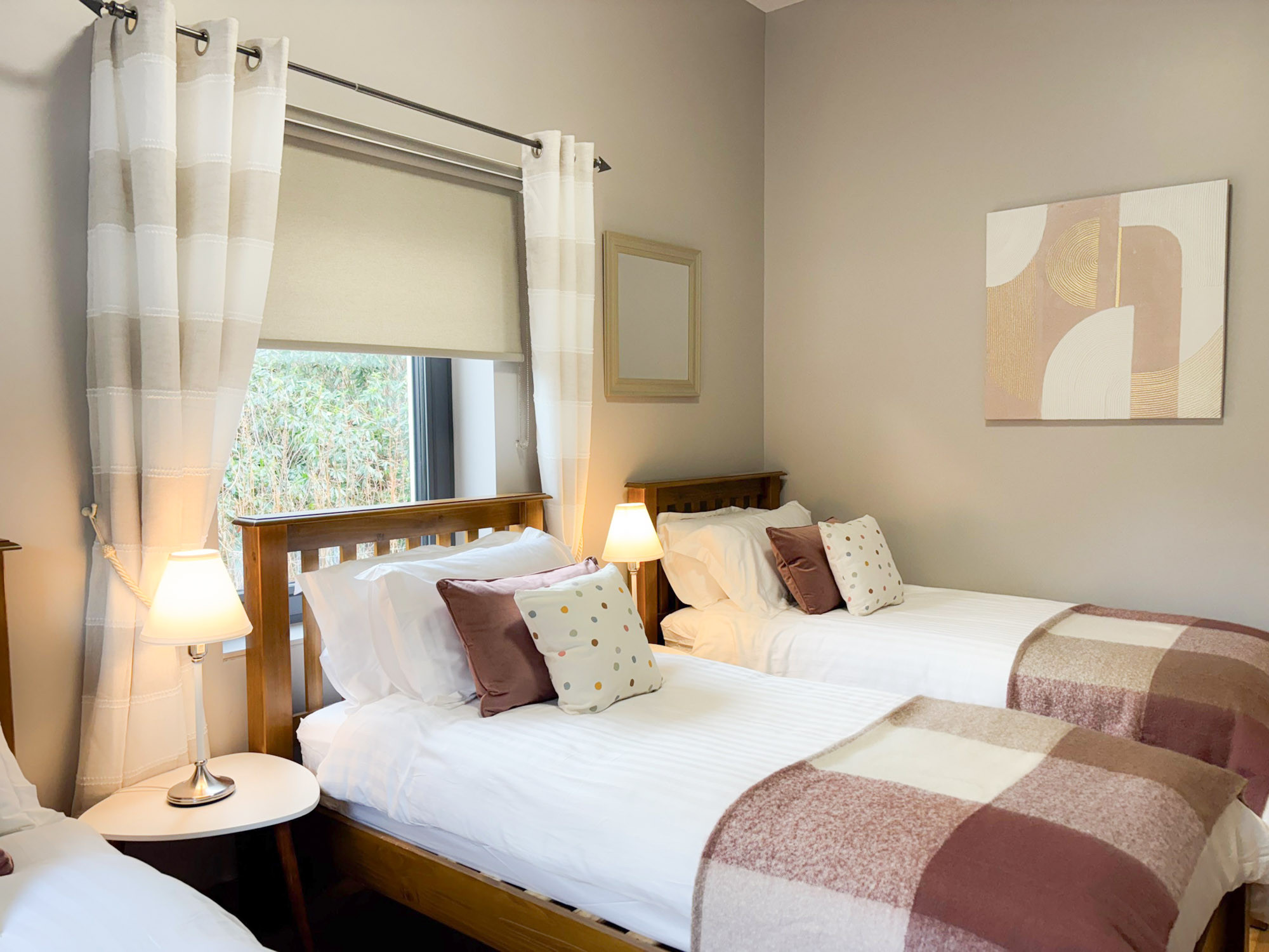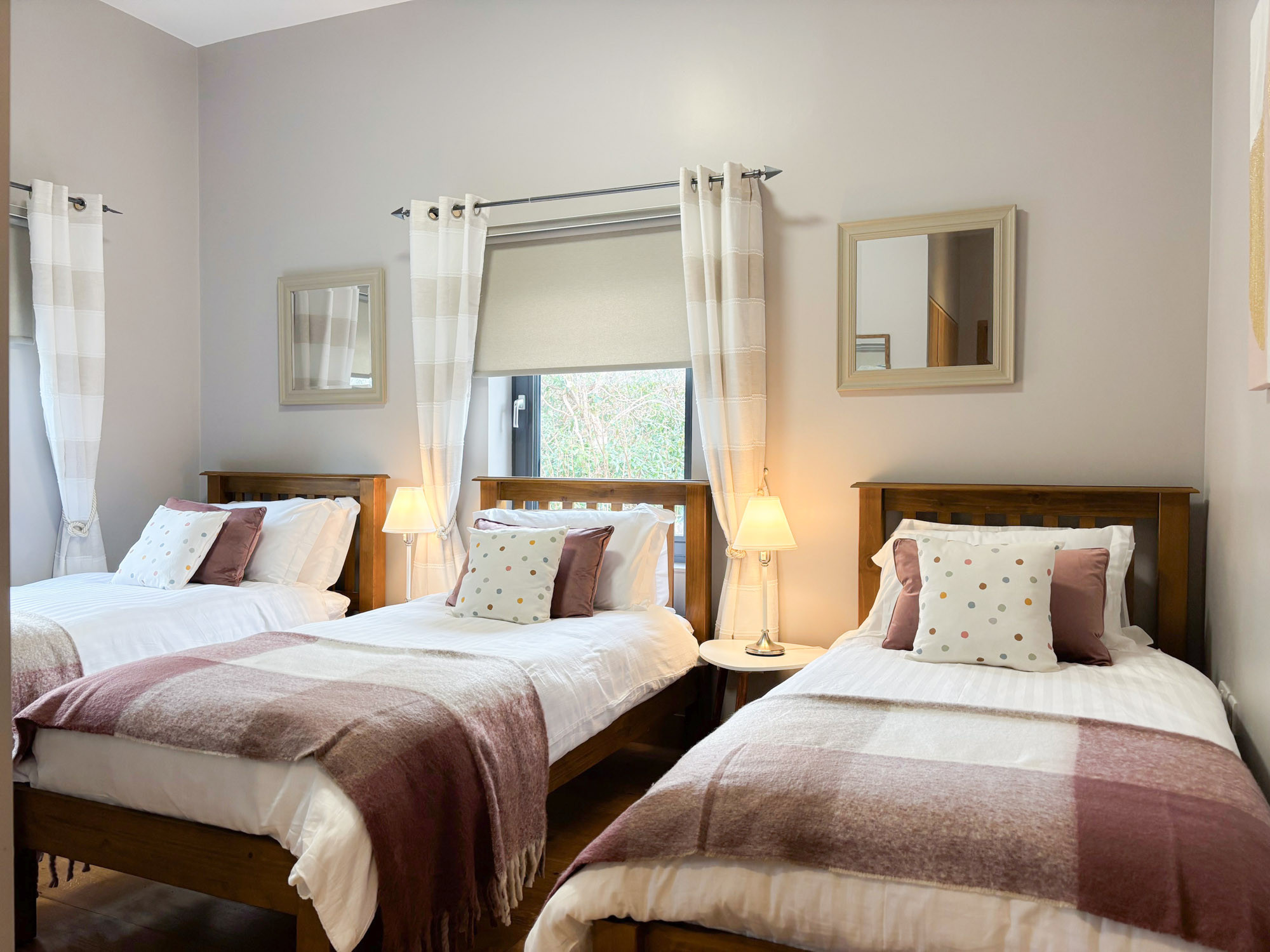 - Bedroom 1: Triple room with three single beds and en-suite (wet room shower, WC and hand basin), sleeping 3