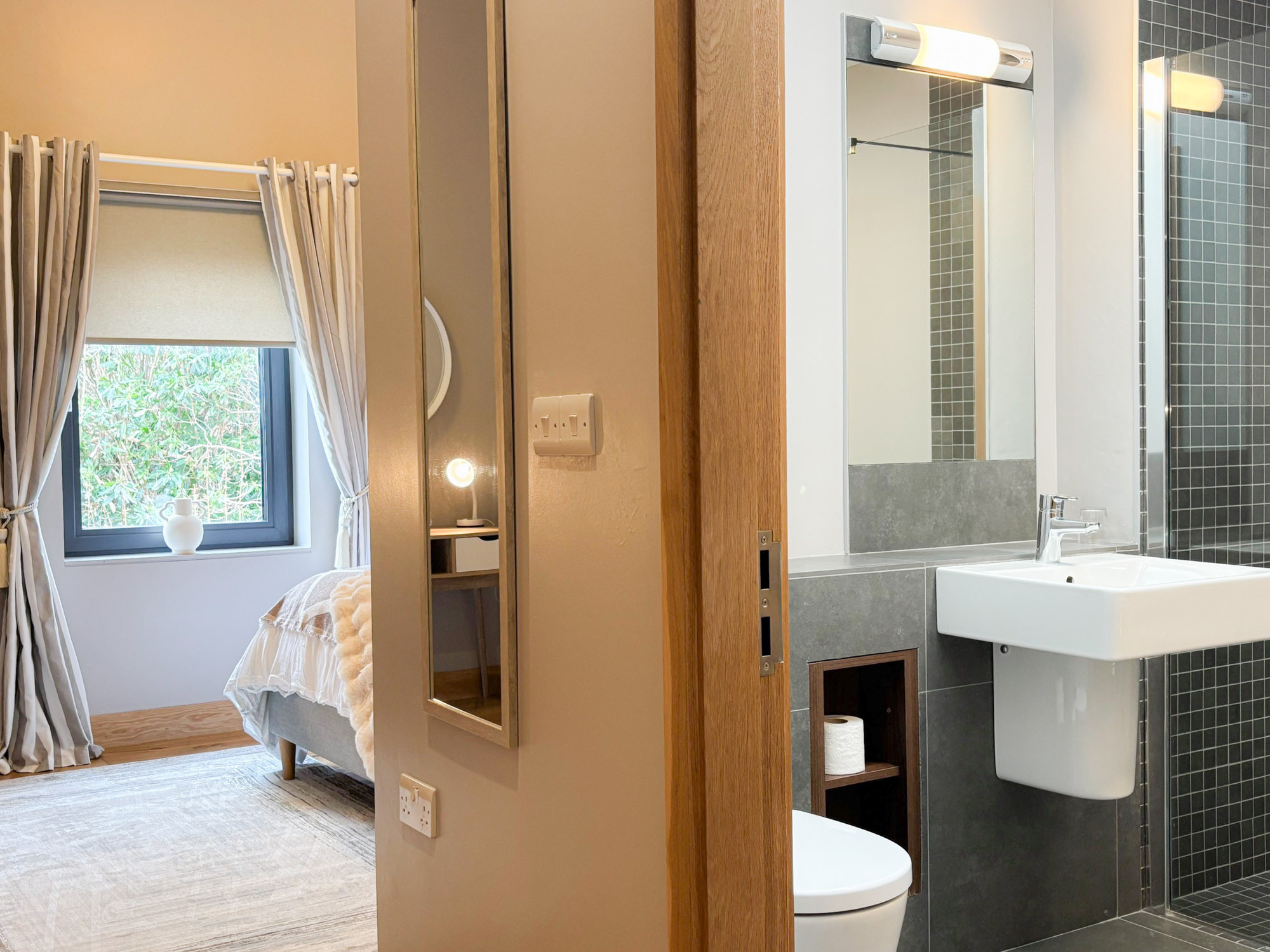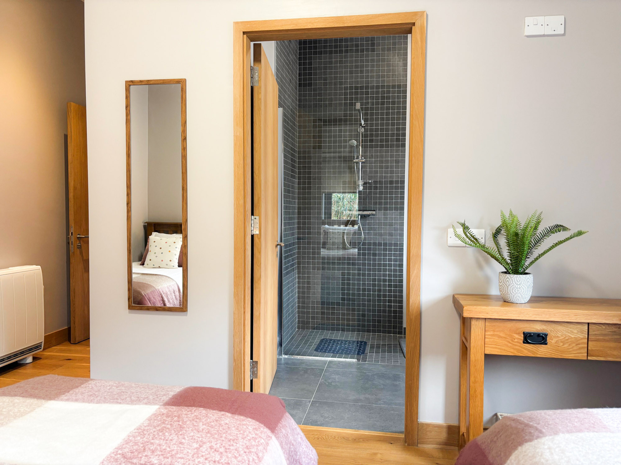 - Bedroom 2: Double bedroom with en-suite (wet room shower, WC and hand basin), sleeping 2