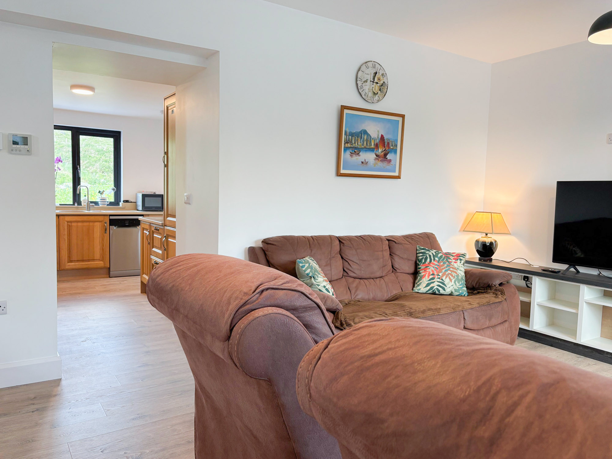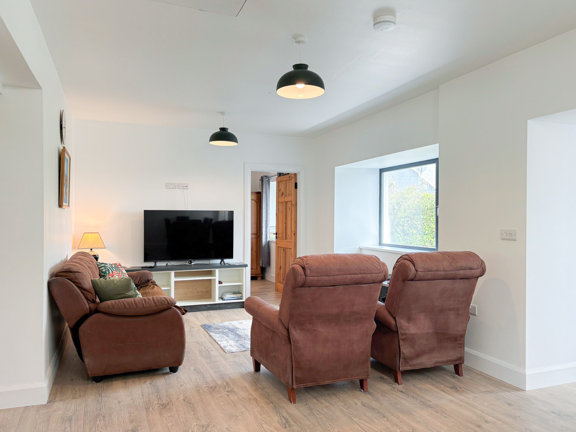 - Living area with sofa, armchairs and large flat-screen TV
