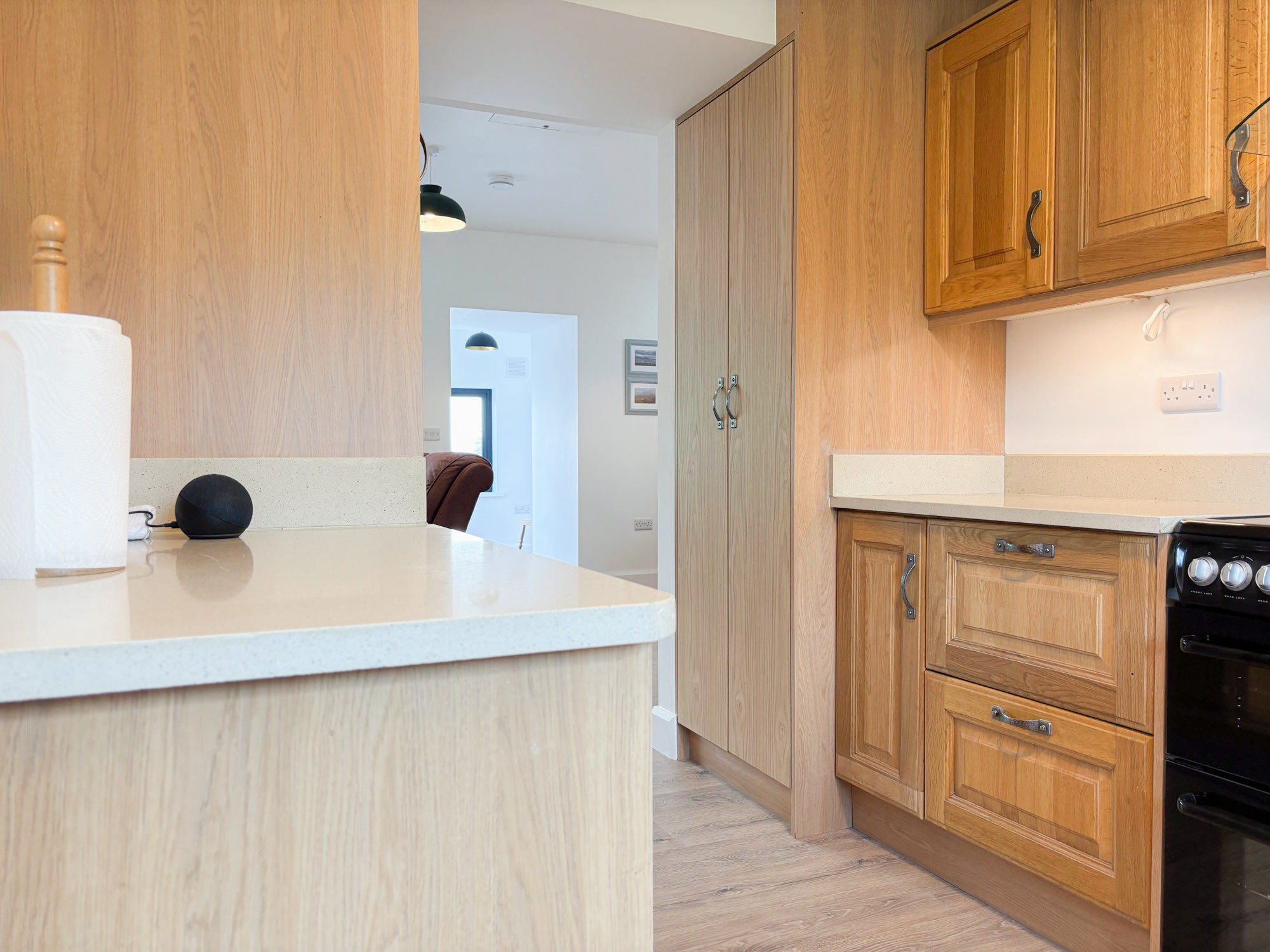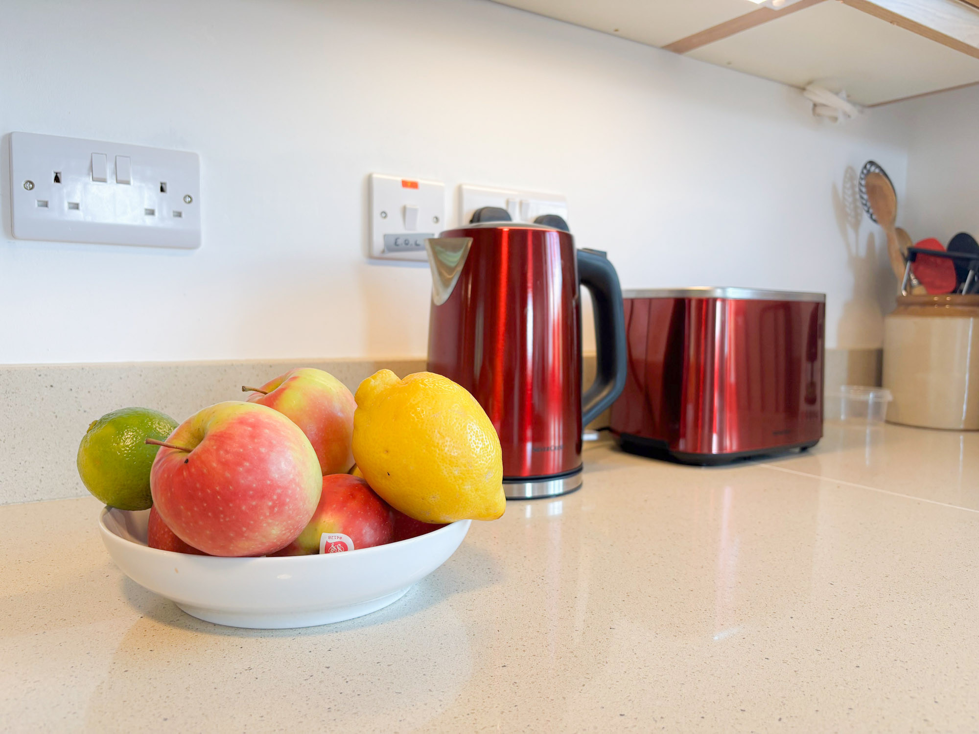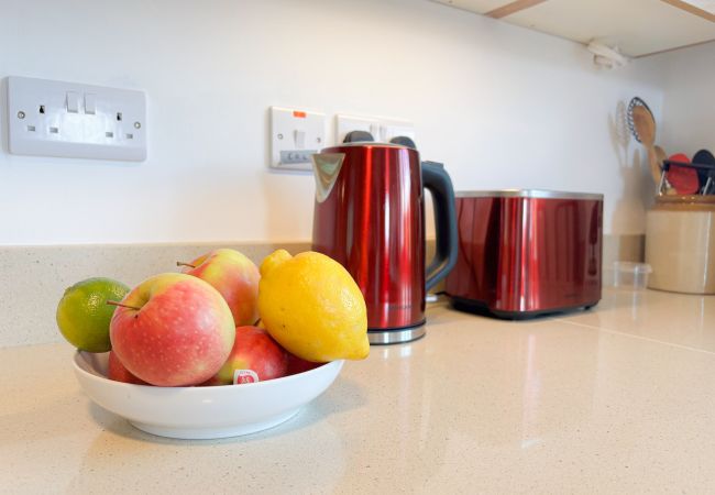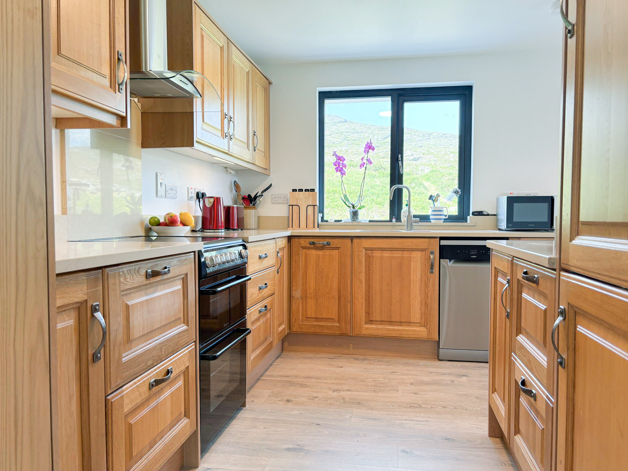 - Country-style kitchen with electric cooker, hob and grill, fridge freezer, dishwasher, microwave, kettle, toaster and coffee maker